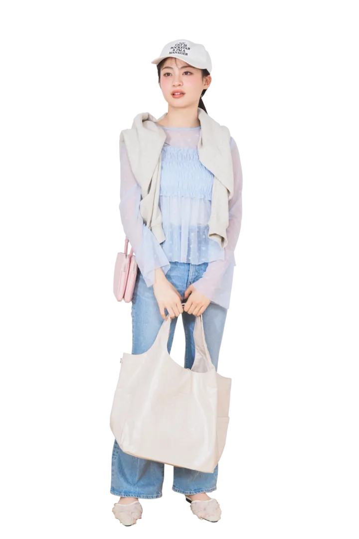 フェミニンな印象のシアートップスで女のコらしさをアピ♡ 甘すぎない着こなしでキャンパスコーデにも◎。