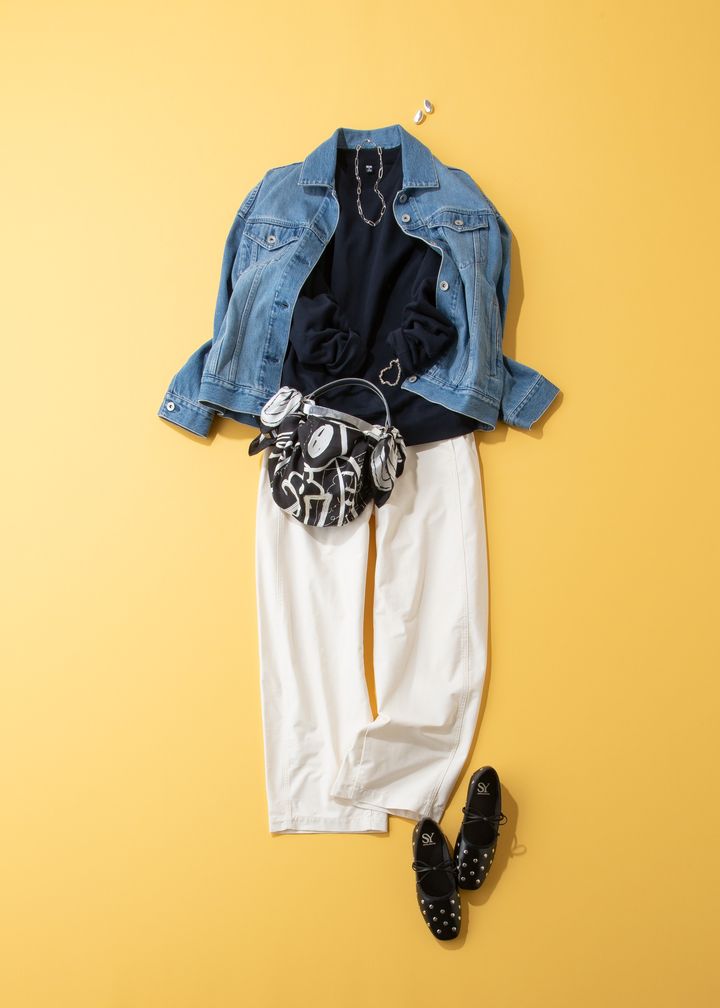 デニムオーバーサイズジャケット¥4,990スウェットシャツ¥2,990※メンズアイテム ジャージーバレルレッグパンツ¥3,990(すべてユニクロ)バッグ¥41,800(マニプリ)シューズ¥14,300(シー ユナイテッドアローズ)ピアス¥47,300<マッソーズ・アンド・マッソーズ>ブレスレット¥42,900<ニナ・エ・ジュール>(ともにショールーム ロイト)ネックレス¥291,500(ウノアエレ/ウノアエレ ジャパン)