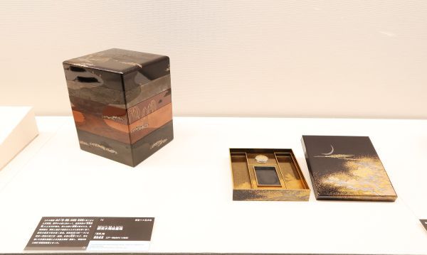 右は清水九兵衛(しみずくへい)作の《浪月蒔絵硯箱》。 清水九兵衛は、江戸時代、加賀藩第3代・前田利常(まえだとしつね)に招かれ金沢で加賀蒔絵の基を築いた蒔絵師です。