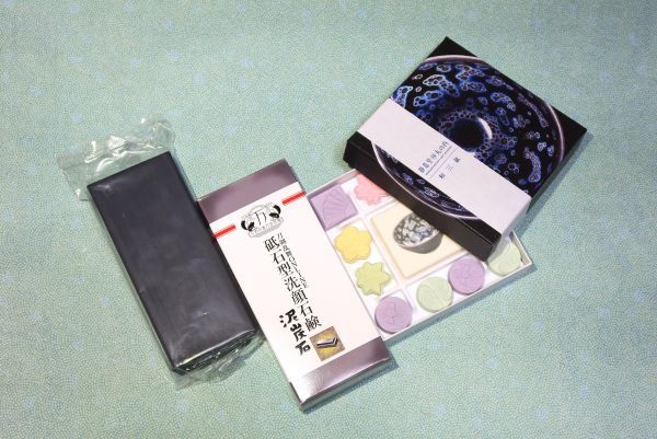 ミュージアムグッズは、和三盆 黒の奇跡(曜変天目)(1‚100円)、刀剣乱舞ONLINE 砥石型洗顔石鹸 泥炭石(1‚250円)を購入。 自然由来の砥石型洗顔石鹸で磨いて黒鉄の刃のごとくピカピカに⁈なるかもしれません。※価格はすべて税込みです。在庫はご確認ください。