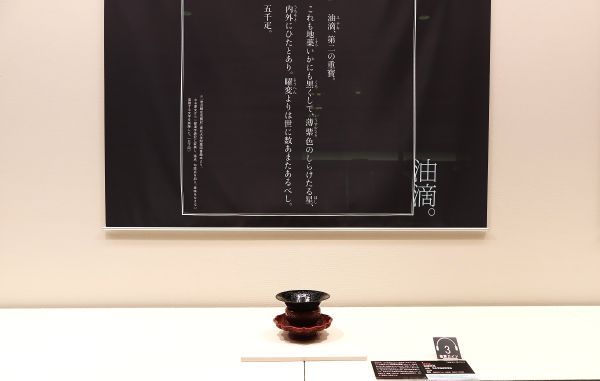 重要文化財《油滴天目》 建窯 「新」銘 南宋時代(12~13世紀) 附属 花卉文堆朱天目台 明時代15世紀 ほか、展示風景 (公財)静嘉堂蔵