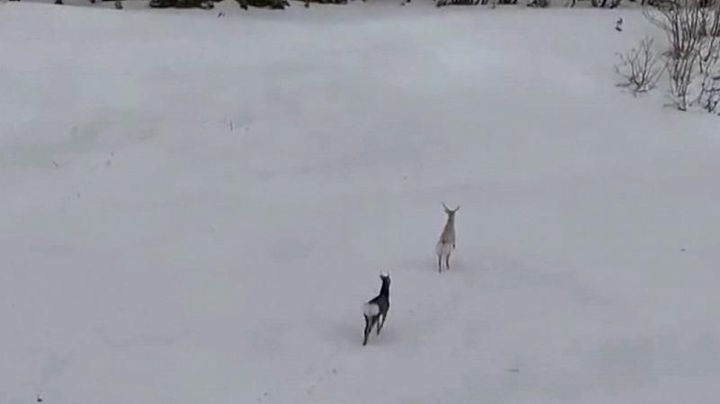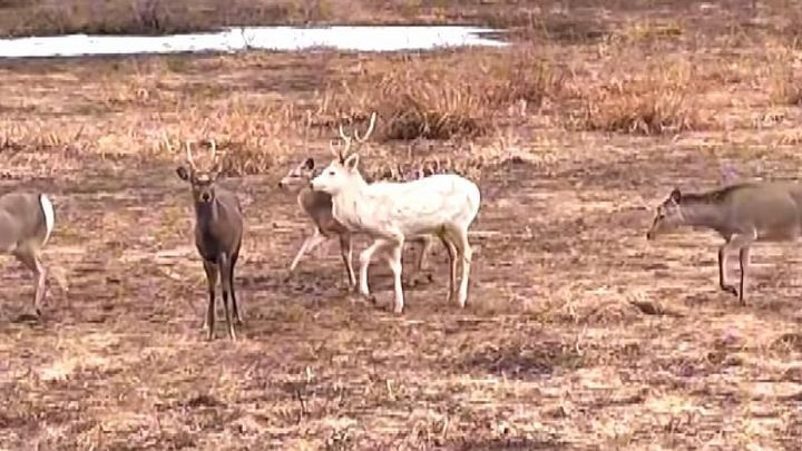 北海道北部の天塩町で、体毛が白い珍しいシカが撮影されました。