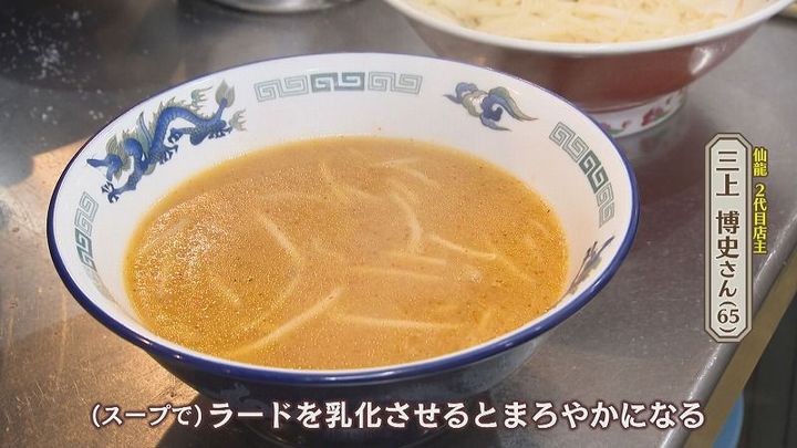 店主 三上さん:「鶏ガラ、豚骨、香味野菜が入っている。スープでラードを乳化させるとまろやかになる」