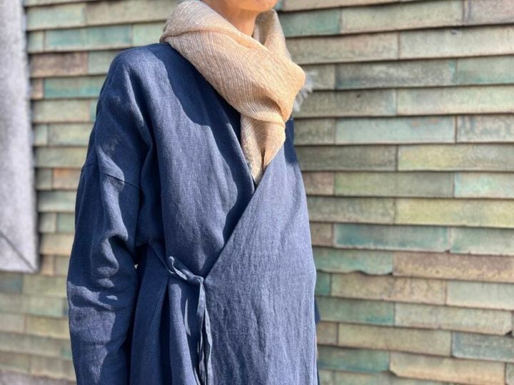 着物のように前見頃を重ね、脇の紐結いで身にまとうカシュクールワンピ。「柔かな風合いがコットンみたいにナチュラルなのですが、実は麻素材で、肌心地がさらりとしてとても気持ちいいんです」。細かい凸凹が涼やかな絹のストールは「真木テキスタイル」のもの。「冷え対策にはこうして首元に巻くと効果的です」とminaさん。