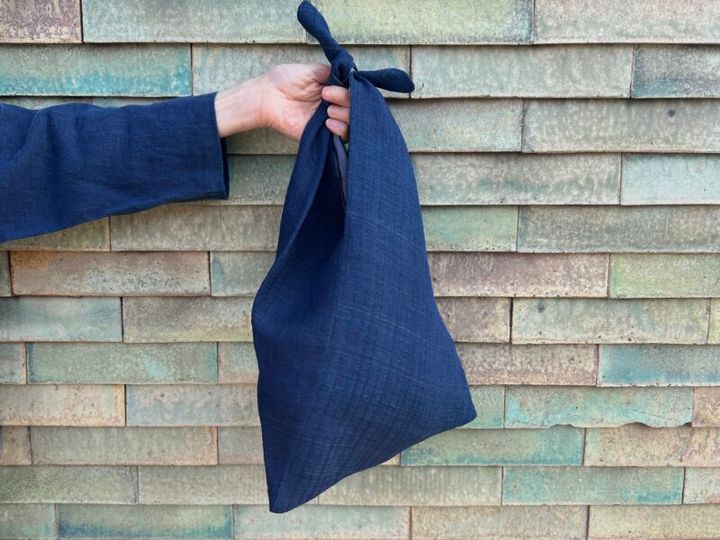 同じく「茶衣」のあずま袋は、リバーシブル。「表がシルクの織り、裏はシルクの染め生地で作られています」。一般的なあずま袋と比べて、ぐっと縦長のシルエットがスタイリッシュな印象。小さく畳んでバッグに忍ばせておけば、エコバッグ代りにも。