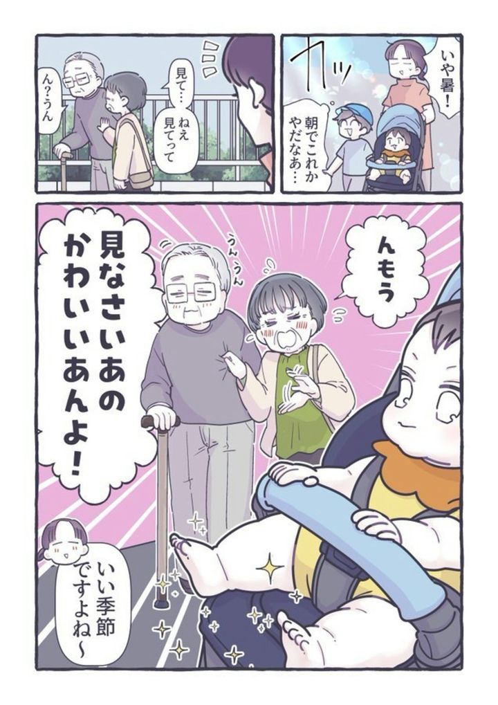 冬は赤ちゃんも厚着をしているので、なかなか素足を見ることはできませんよね。しかし、暖かい季節になると、かわいいあんよがお出ましになります。ある日、るしこさんが赤ちゃんとお散歩をしていると、年配のご夫婦とすれ違いました。るしこさんは家族の日常をマンガに描いているそうで、その日の1コマをぜひごらんください。