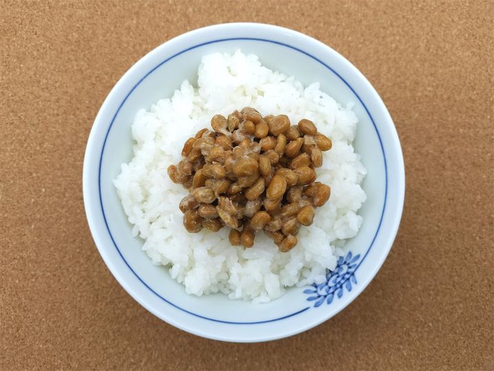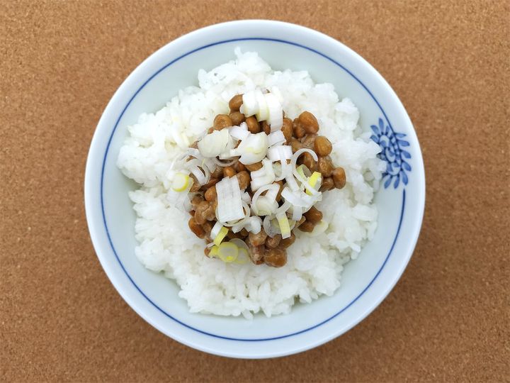 1. 茶碗に温かいご飯を盛り、納豆を乗せます。
