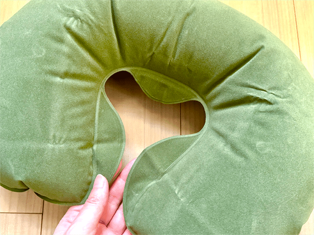 100円でこのクオリティなら充分! 肌触りは断然普段愛用している無印良品のネックピローに軍配が上がるのですが、らくらくエアー枕も表面はやわらかいフロック加工がされていて配慮や工夫が感じられますね。
