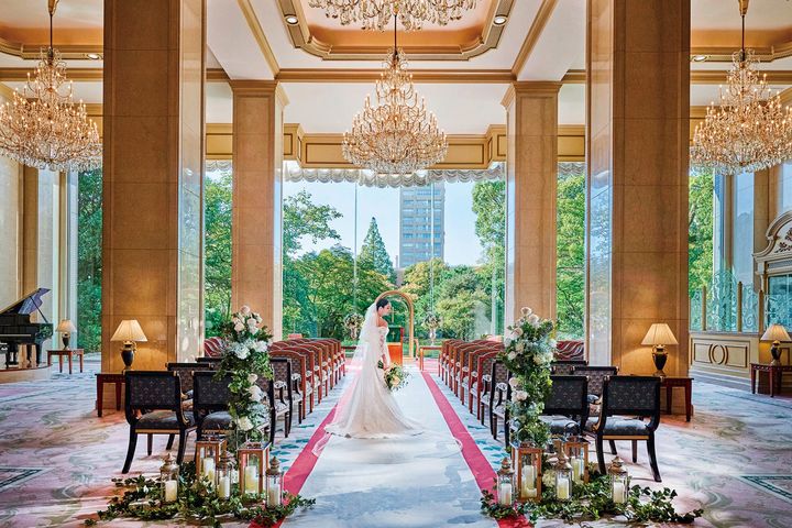 窓一面に広がる自然を前にエレガントな愛の誓いをヨーロピアン・クラシックなインテリアで王道ウエディングが叶う会場「リーガロイヤルホテル東京」。館内チャペルでの挙式のほか、大きな窓から緑豊かな庭園を望む「ガーデンラウンジ」でのセレモニーに注目を。吹き抜けの天井には豪奢なシャンデリアが煌めき、ロイヤル・ウエディングを彷彿させる優美な世界が広がります。