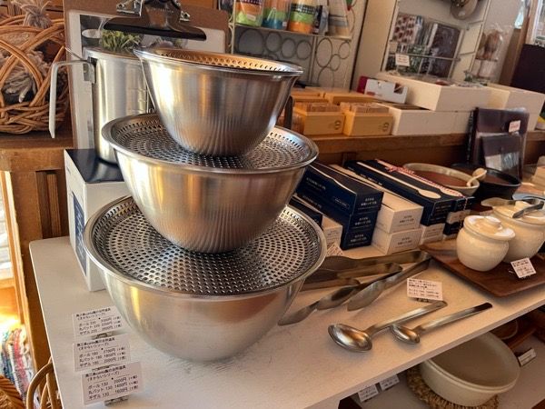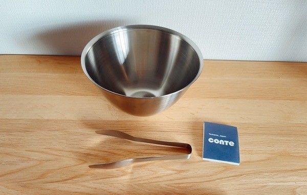 まかないボウルも底に向かってとんがっているので材料がまとまりやすく、安定感があって調理しやすかったです。しかもこのボール、どの方向から注いでも液だれなし。CONTEの台所道具はどれも使い易いだけでなく、美が備わっています。と白石さん。このシリーズの、丸バット・平ザルなども少しずつ揃えていけたらいいなーと思っています。