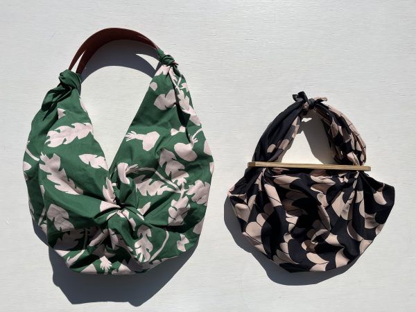 従来のイメージを払拭するような色柄のふろしきの数々にうっとり。ふろしきってあまり馴染みがないかもしれませんが、モノを包むだけではなく、結んだり、パーツをつけたりすることで、写真のような素敵なバッグになって大活躍します。ふろしきという名の正方形の布でできることが、こんなにあるなんて!