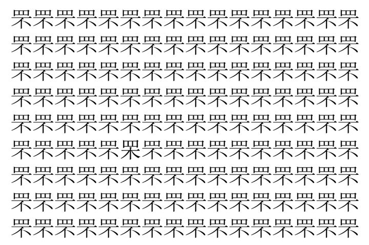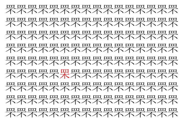 画像の中には、「罘」という漢字が縦に9行、横に16個並んでいます。 全部で144個となりますが・・・、そのうち1つは「異なる漢字」となってますよ!!