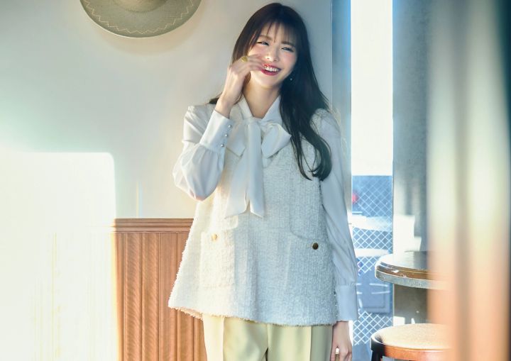 パンツ¥14,300/ストロベリーフィールズ(シュガー・マトリックス) ツイードベスト¥19,800/Stola. ボウタイブラウス¥8,690/WILLSELECTION ルミネエスト新宿店 ピアス¥13,640/フル・オブ・グレイス(ズットホリック) リング[左手]¥9,020、リング[右手]¥10,560/ともにチビ・ジュエルズ(チビ・ジュエルズ・ジャパン) バッグ¥8,800/オリエンタルトラフィック(ダブルエー) バッグに巻いたスカーフ¥8,910/アンタイトル パンプス¥15,400/ダイアナ(ダイアナ 銀座本店)