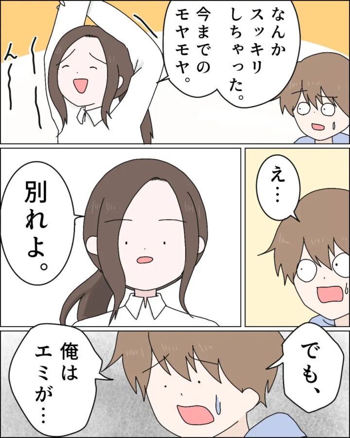 「なんかスッキリしちゃった。今までのモヤモヤ」と、「ん~~っ」と伸びをするエミさんに、「え・・」と驚くレイさん。エミさんが「別れよ」と真顔で言うと、「でも、俺はエミが・・」と焦り出します。