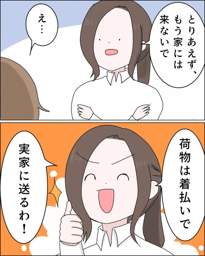 レイさんの言葉を最後まで聞かず、「とりあえず、もう家には来ないで」とエミさんが言うと、「え・・」言葉を失うレイさんに、「荷物は着払いで実家に送るわ!」とキッパリと言い放ったのでした。