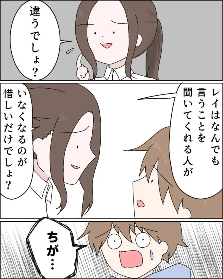 すかさず「違うでしょ?レイは、なんでも言うことを聞いてくれる人が、いなくなるのが惜しいだけでしょ?」エミさんがそう言うと、「ちが・・」と否定しようとするレイさん。