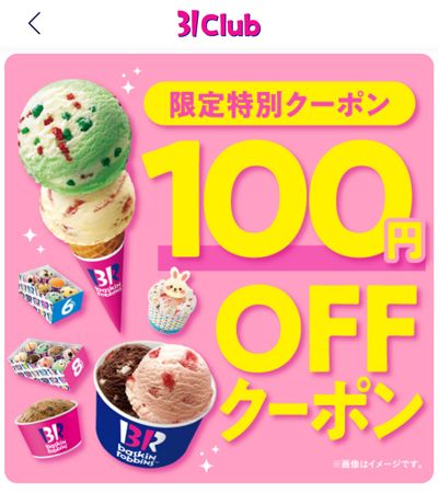 サーティワンの公式アプリ「31Club」で、4/29(火)まで使える100円OFFクーポンがもらえます。