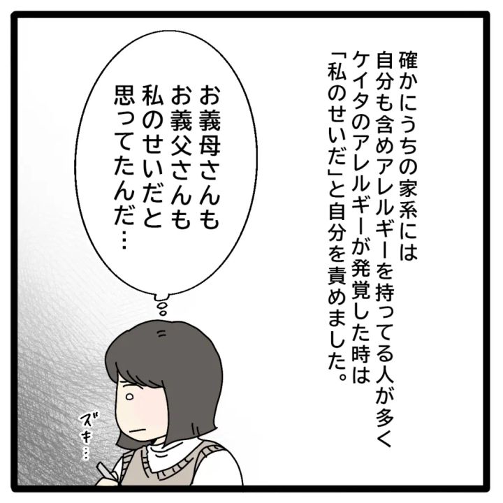 確かに、うちの家系には、私も含めアレルギーを持っている人が多いので息子のアレルギーが発覚した時は『私のせいだ』と自分を責めていたこともありました。でも後ろ向きな気持ちにばかりなっていても仕方がないと気持ちを切り替えていたのに「お義母さんもお義父さんも私のせいだと思ってたんだ・・」と思い、心が痛くなりました。