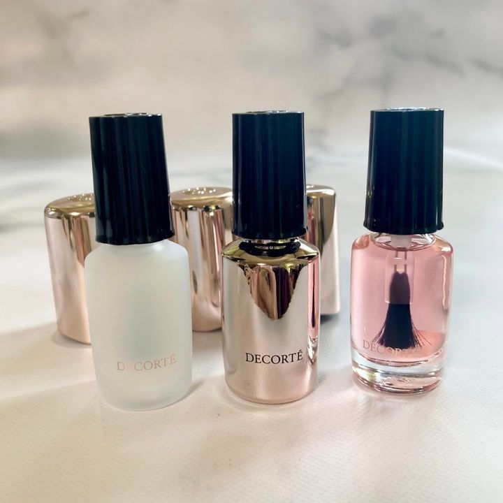 セルフネイルにおいて欠かせないトップコートとベースコート。なくてももちろん爪に色はのりますが、塗ったと塗らないでは発色や色持ちが全然違うのです! とはいえ、私もついついベースコートをサボってしまいトップコートだけという時も多々……。ですが、コスメデコルテは、そのどちらの役割も叶えてくれる嬉しい2way仕様。クリスタルのような光沢感をプラスするクリアカラーと、美しい血色感をほのかにプラスしてくれる2種類から選べます。さらに、爪周りの乾燥や二枚爪などお悩みの方にはオイルケアもオススメ。普段ネイルができない方やギフトとして贈っても喜ばれること間違いなし。