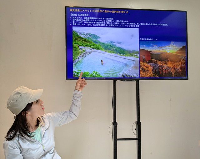 秘湯探検家・渡辺裕美さんは「まさに春夏こそシーズン!」と言い、標高の高いところでぬる湯に入ることができる点がおすすめだと解説。