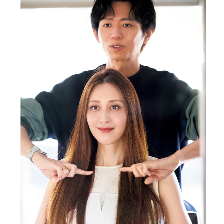 表面の毛を持ち上げながら、内側にレイヤーを入れてカットしたことで、エアリー感が生まれました。ロングのときは前髪がなく面長が強調されていたので、前髪を顎より上、唇より1cm下にカット。鎖骨ボブにニュアンスが生まれ、あか抜け小顔スタイルに。