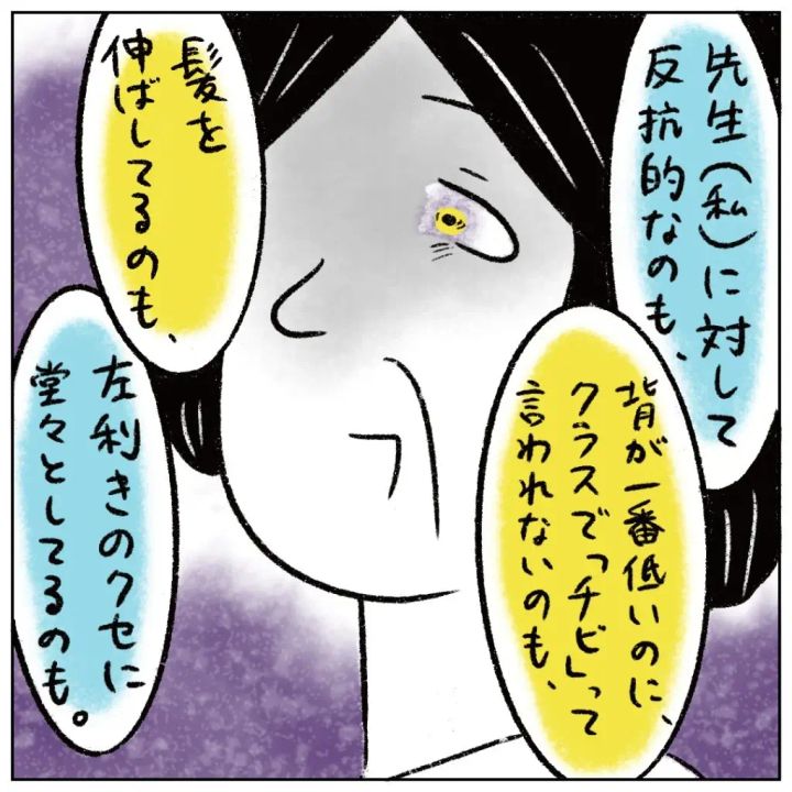 開き直った性根先生は次々と本音を口にします。「先生(私)に対して反抗的なのも、背が一番低いのにクラスで『チビ』って言われないのも、髪を伸ばしてるのも、左利きのクセに堂々としてるのも」