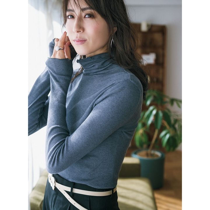 ソフトでフィット感のある素材ならでは、首や袖のくしゅくしゅもニュアンスをプラス。インもすっきり、ワイドボトムスとも好バランス!