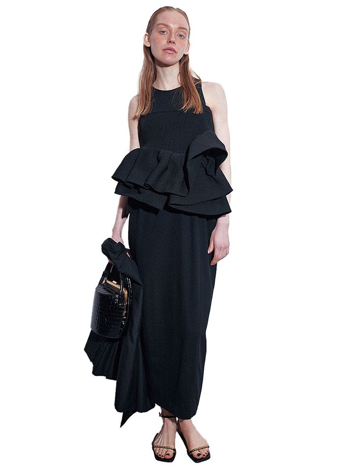 立体的なフリルをまとったドレッシーなベアトップ。ハリのあるニットでつくるティアードの、贅沢なボリューム感。伸縮性にも優れているからレイヤードしたときにもたつきにくく、ズレにくいのも利点。すらりとした印象はそのままに部分的な着飾りで目にとまるインパクトを獲得できる。
