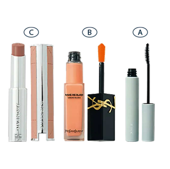 まつ毛は上下ともをしっかり塗って、パチッと開いた丸い目に見せてガーリーな印象を引き出す。チークはをほおの高め内側に塗ることで、少しカジュアルさを出す。