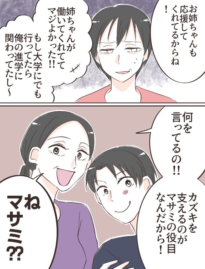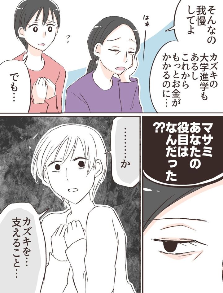 それを聞いたお母さんは「何を言ってるの!!カズキを支えるのがマサミの役目なんだから!ね、マサミ??」と聞いてきたのでした。