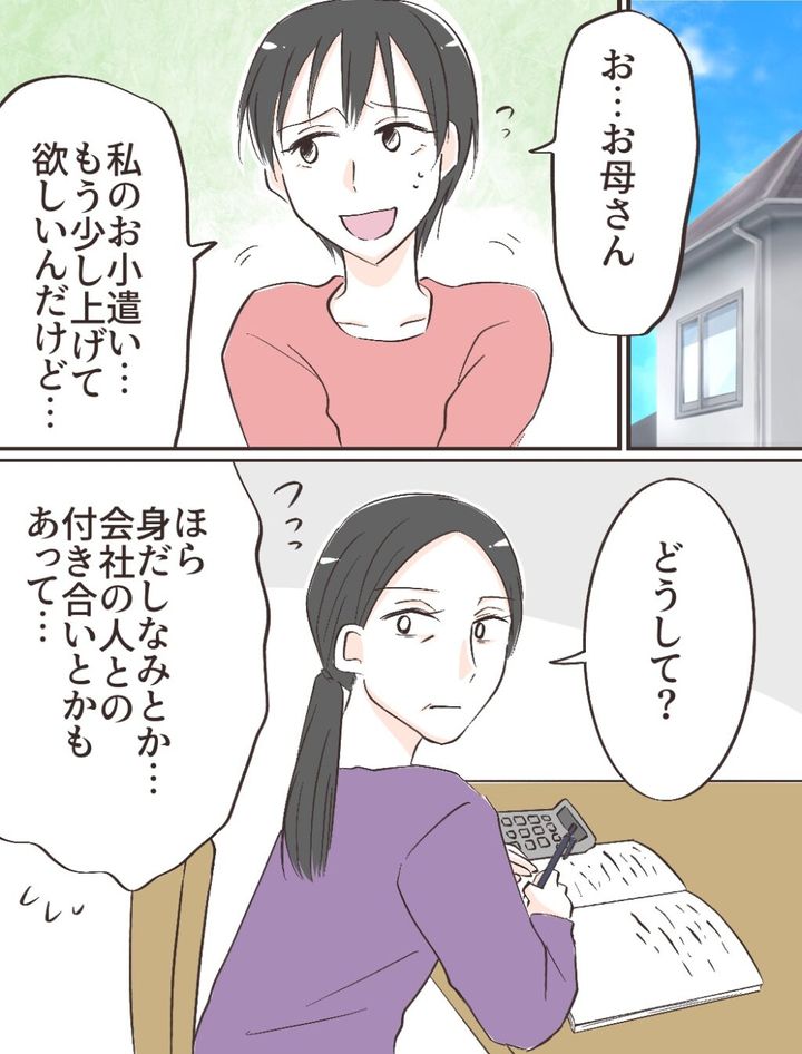 マサミさんは「お・・・お母さん。私のお小遣いもう少し上げて欲しいんだけど・・・」と頼みます。
