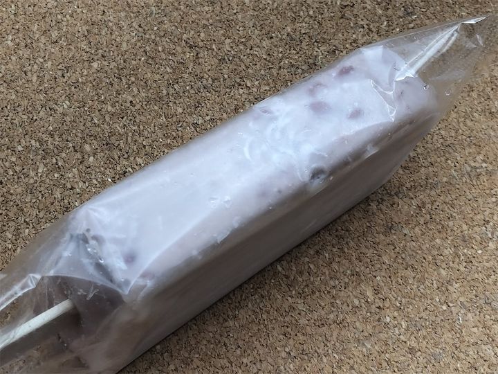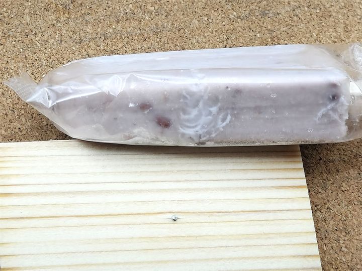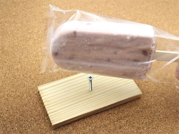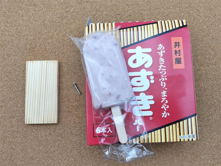 あずきバーは1本あれば事足りるのですが、なぜか近所のスーパーには6本入りの「BOXあずきバー」しかありませんでしたので今回はBOXを購入。もし失敗して割れてしまった時の予備だと思えばいいし、どちらにせよ食べればいいので問題なしです。また釘を打っている途中で割れて飛び散ると大変ですので袋をかぶせようと思っていたのですが、幸いにも1本ずつビニールで個包装されていました。なので、このまま使用します。この方が衛生的ですので丁度よかったです。
