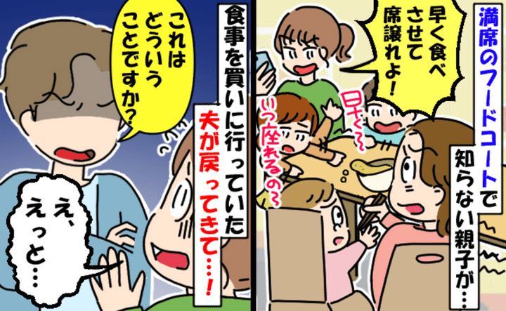 1歳の娘と夫と3人でショッピングモールに行ったときのことです。お昼前に買い物を終え、娘を乗せたカートを押して早めにフードコートに向かいました。休日ということもあり、すでに席は埋まり始めていましたが、4人席を無事に確保。娘はまだ食事の手助けが必要なので、先に私がうどんとおにぎりを買い、夫は私が食べ終わってから食事を買うことにしました。私の食事から分けたうどんやおにぎりを、夫が娘へ食べさせ始めます。うれしそうに食べる娘を見ながら、急いで食べ終えた私。食事の介助を交代し、夫が食事を買いに席を立ちました。