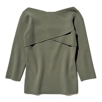 カーキクロスリブニット/MOUSSY(バロックジャパンリミテッド) クロスの胸元が華奢な鎖骨を強調するセンシュアルな1着は、渋めのカーキを選んでバランスを調整。