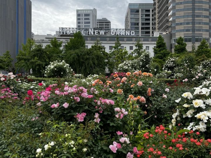 中でもおすすめなのは、横浜を代表する山下公園内にある未来のバラ園。ここでは約160種1,900株ものバラが植えられており、観賞することができます!写真は昨年(2024年5月6日)の様子でちょうどゴールデンウィークの時期にきれいに咲いていたので、今年も連休中のおすすめスポットになるかもと期待しています♡