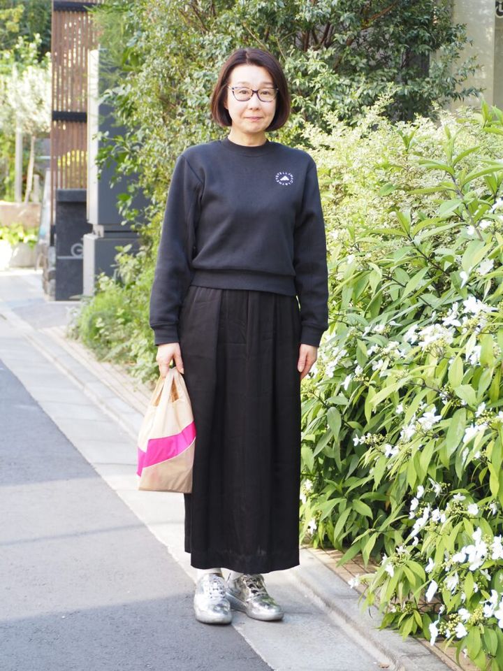 「シンプルなコーディネートこそ、丈感や素材選びが重要だと思います」とカザマさん。しなやかに揺れるシルクのロングスカートとスウェットのテイストミックスで、大人のカジュアルスタイルが完成! ショート丈のトップスを選ぶことで脚長効果も◎。シルバーのスニーカーがワントーンコーディネートのはずしに一役買っています。