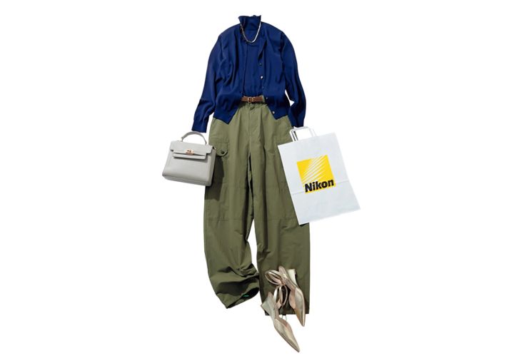 今日はカーゴパンツを、アンサンブルと小物でキレイめに見せる作戦!上品見えするネイビーの安心感は唯一無二。靴にアクセ、ベルトやバッグの金具までゴールドで統一して、完成度高くいきます。