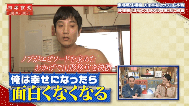 東京から東北に移住した芸能人が移住先の魅力を紹介する「東北移住相席」に“山形県住みます芸人”のソラシド・本坊が登場。山形県への移住のきっかけが、千鳥・ノブの一言だったと告白した。
