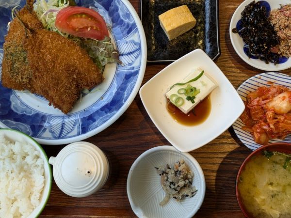 優しい味わいの味噌汁や、アジフライの下にまでしっかりと盛られたサラダ、豆腐や卯の花など、ヘルシーなメニューも多くて栄養バランスもばっちりです。 メインのアジフライはドカンと2尾!1つにはタルタルソースをたっぷりかけてみました♪