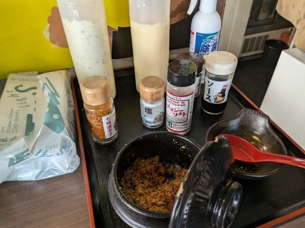 隣には、タルタルソースやマヨネーズ、具沢山のふりかけもありますよ。小皿に好きなだけ盛ることができて、お替わりもできるという嬉しすぎるサービスです。