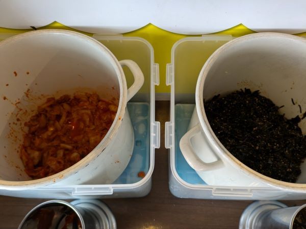 運ばれてくるまでの間、お店中央の漬物コーナーへ。寸胴鍋くらいの大きさの壺に、キムチと昆布の佃煮が入っています。
