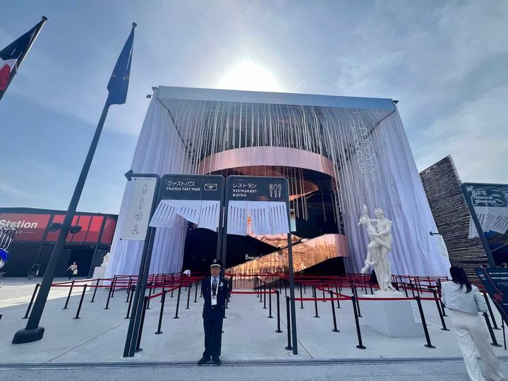 東ゲートから入り、大屋根リングをくぐるとすぐにあるフランス館。パビリオンのエントランスは、神秘的な雰囲気の劇場がデザインされ、外側は、劇場のカーテンのようなベールで覆われています。