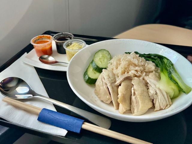 筆者が搭乗した際は、「シンガポールチキンライス」に出会えました。機内で調理したとは思えないふわふわのチキン、ジャスミンライスには出汁がたっぷり。