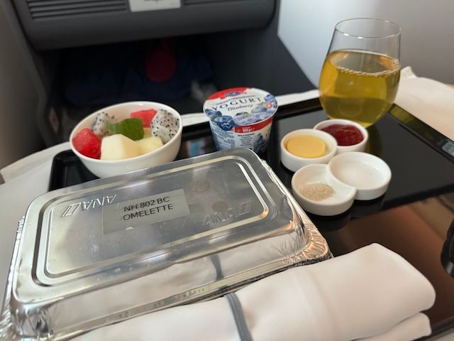 筆者が搭乗した5月のフライトでは、このような写真のものが提供されました。(パンが苦手で除いています)しかし、個人的にはオールデイダイニング(どのタイミングでも食べられる食事)がアツい! と感じました。