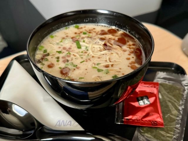 他の路線でも出会えますが、機内食でとんこつ風ラーメンを味わうことができます! 嬉しいのがプラントベースでできているのでベジタリアンの方でも楽しめるラーメンだということ。