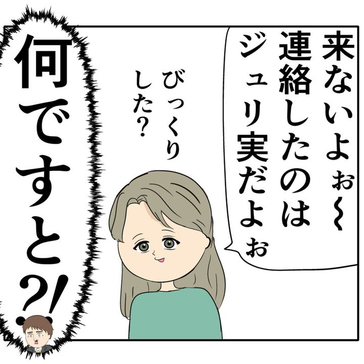 すると、「来ないよぉ~。連絡したのはジュリ実だよぉ。びっくりした?」とあっけらかんと言うジュリ実さん。まさかの告白にろみ緒さんは「なんですと?!」と衝撃を受けます。