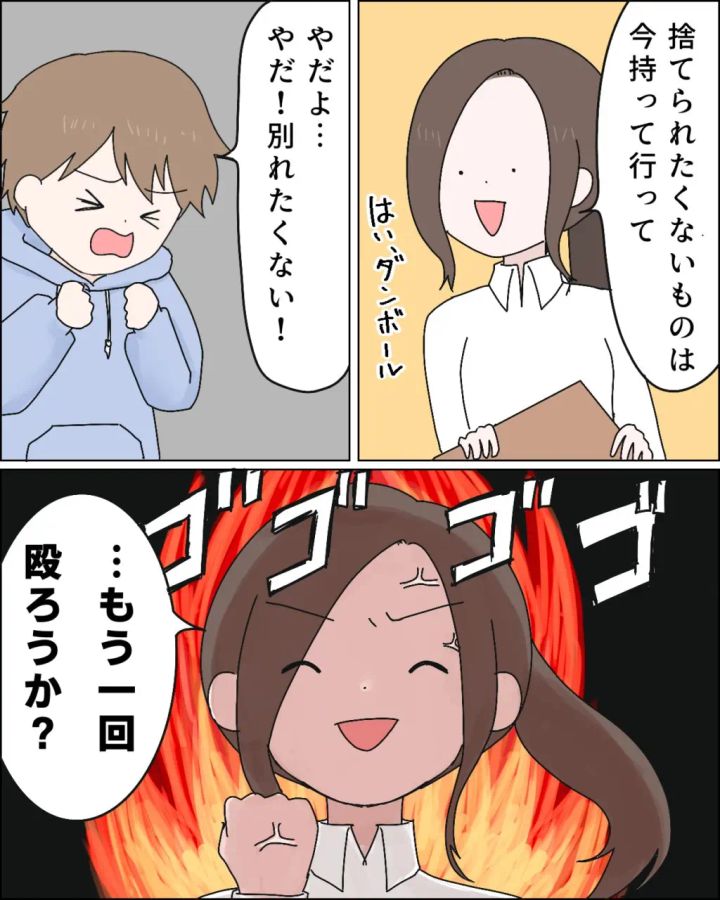「捨てられたくないものは今持って行って。はい、段ボール」レイさんの言葉をスルーしたエミさんがそう言うと、「やだよ・・やだ!別れたくない!」と渋るレイさん。