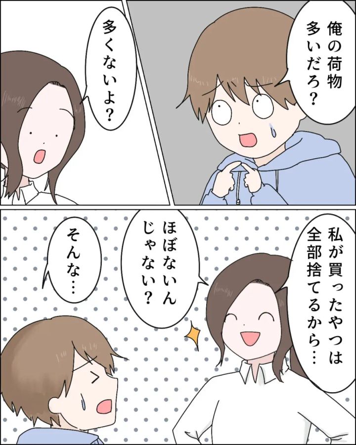 今までのモヤモヤもスッキリ解消したエミさんが「別れよ。荷物は着払いで実家に送るわ!」と言い放つと、「俺の荷物多いだろ?」と言うレイさん。「多くないよ?私が買ったやつは全部捨てるから・・ほぼないんじゃない?」エミさんの言葉に「そんな・・」レイさんは絶望的な表情をしました。