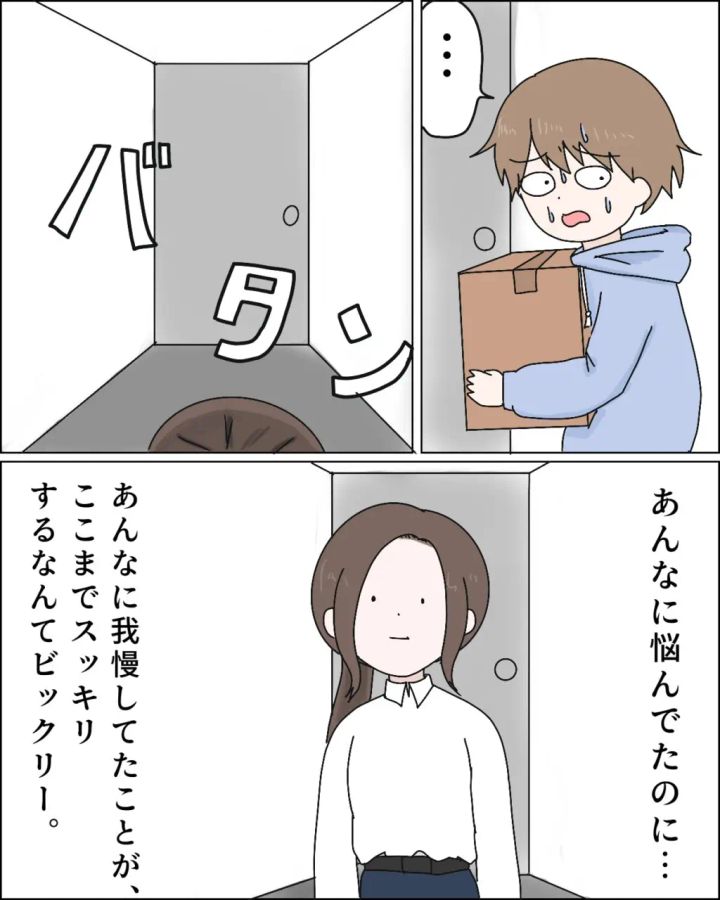 玄関のドアが閉まるのを見届けたエミさんは、「あんなに悩んでたのに・・あんなに我慢してたことが、ここまでスッキリするなんてビックリ」と心の中で呟きました。