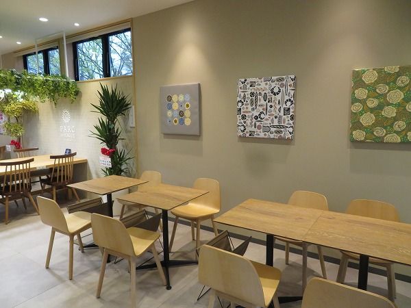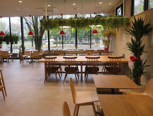 店内には、イートインコーナーも併設。 明るく広々としていて、心地良い空間。大きな窓越しに、公園の豊かな自然を望むことができます。